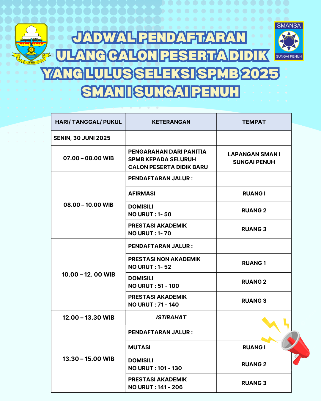 Calon Peserta didik yang dinyatakan lulus diterima di SMAN I Sungai Penuh berdasarkan hasil SPMB 2025, agar dapat melakukan PENDAFTARAN ULANG :